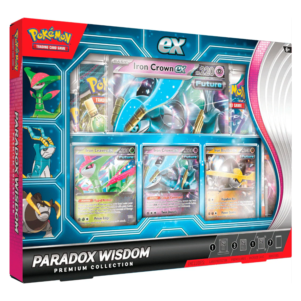 • 3 foil cards featuring Iron Leaves ex, Iron Crown ex, and Iron Boulder ex • 1 Oversize Jumbo iron Crown ex • 1 Magnetic 3-Card Holder • 1 Code Card • 7 Pokémon TCG booster packs