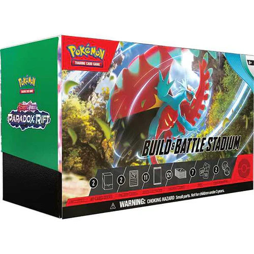 Build two decks with a friend—and then play right away! This Pokémon TCG:Scarlet & Violet—Paradox RiftBuild & Battle Stadium contains a massive set of cards, including two Build & Battle Boxes. Each Build & Battle Box contains four booster packs and a 40-card deck that includes an exclusive foil card. You can play these decks right out of the box or enhance them with cards from the booster packs. Get ready to face your opponents in the Build & Battle Stadium!